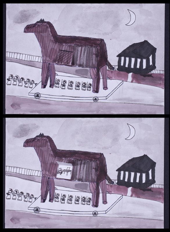Das trojanische Pferd (Lavierte Federzeichnung mit Klappen)