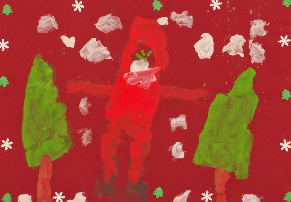 Malerei Deckfarben auf Tonpapier, verziert mit geklebten Stickern